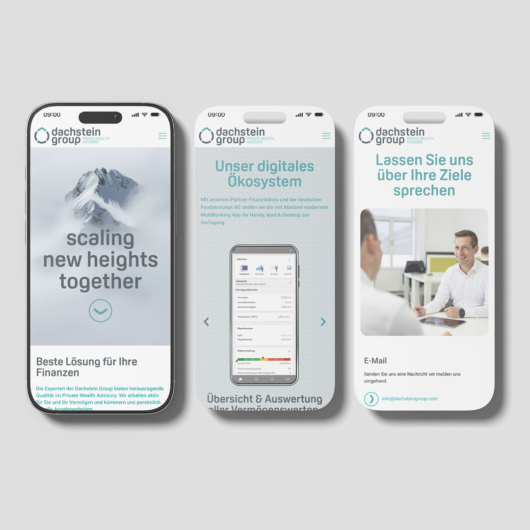 Eine erfahrene Gruppe von Vermögens- und Finanzberatern, die das Portfolio ihrer Kunden in der D-A-CH-Region auf ein neues Niveau hebt. Im Prozess der Namensfindung haben wir einen Bezug zu Österreich hergestellt und gleichzeitig die geografische Zielgruppe integriert. Daraus entstand der prägnante Leitsatz. In der Wort-Bildmarke symbolisieren sowohl die Beratergruppe als auch eine markante Bergspitze die Ausrichtung. Die Website überzeugt durch klare Kommunikation und eine transparente Darstellung der Strukturen.